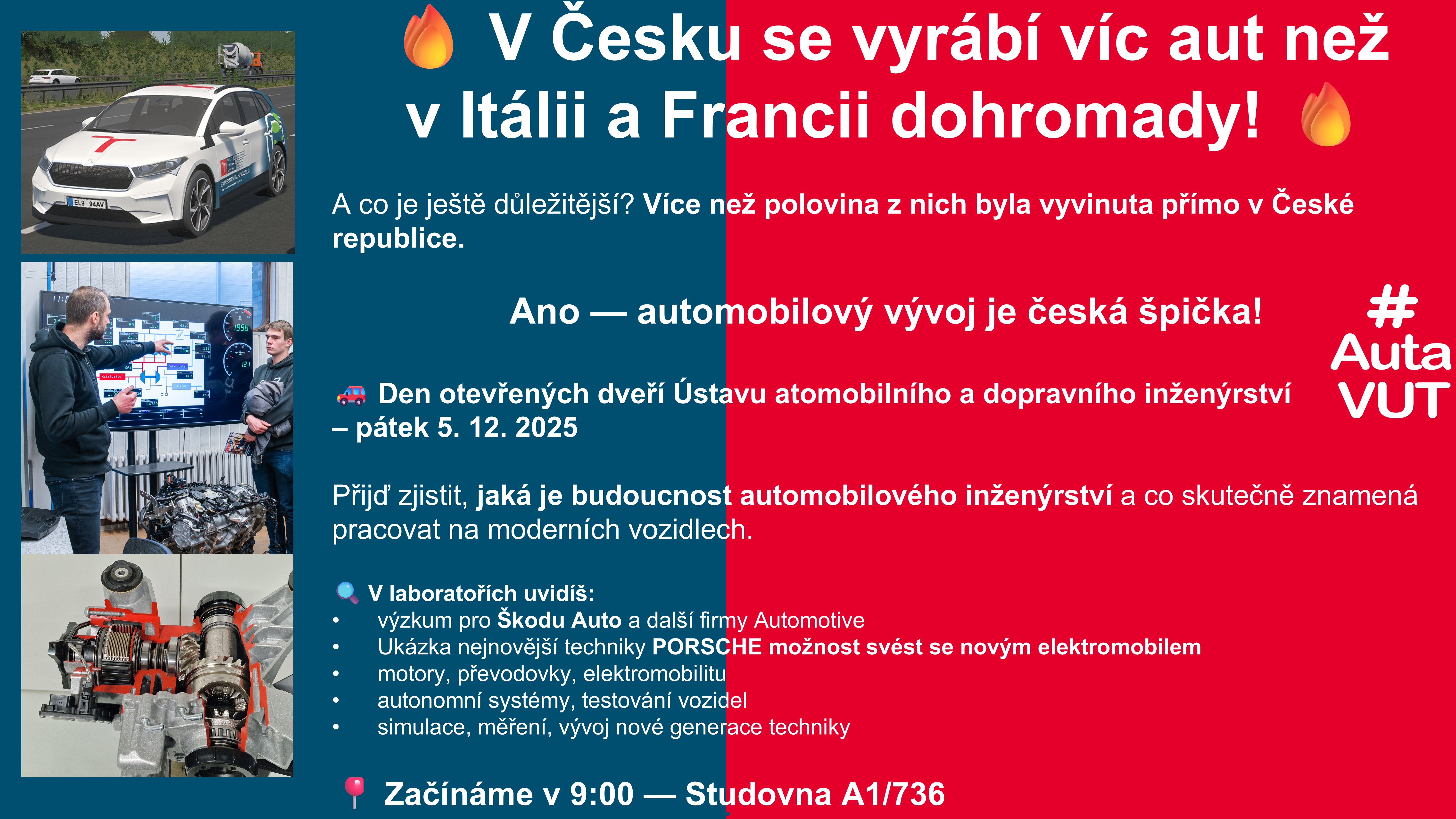 - Ústav automobilního a dopravního inženýrství | pátek 5. 12. 2025 od 9:00 | A1/736 | informace zde a zde