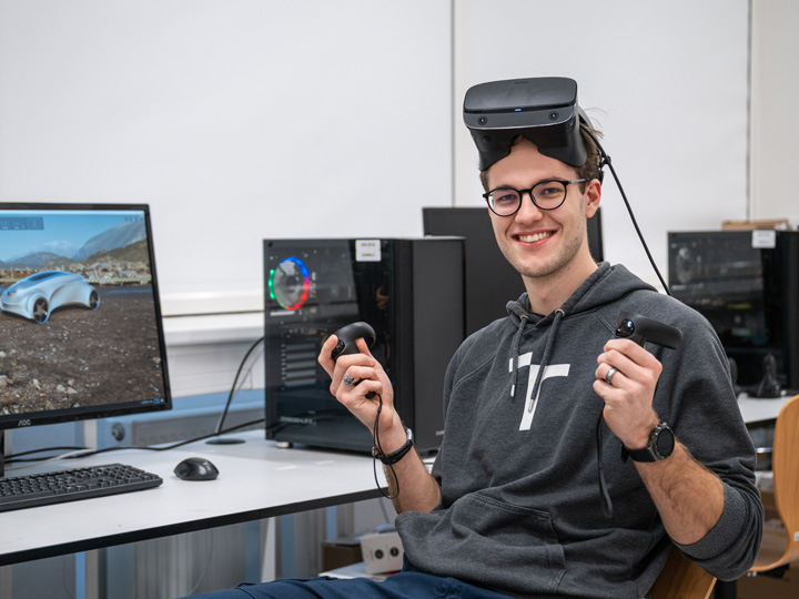 „Program Vizuální komunikace v kreativních průmyslech propojuje technické znalosti se světem umění a kreativity ve stále se rozvíjejícím digitálním prostoru. Osvojíš si zde dovednosti jako jsou 3D modelování, pokročilé vizualizace, animování nebo také využití virtuální reality. Praktické zkušenosti navíc získáš i během semestrální praxe ve firmách zaměřených na kreativní průmysl. Máš další otázky? Nevíš si rady? Neváhej se ozvat, kolego!“